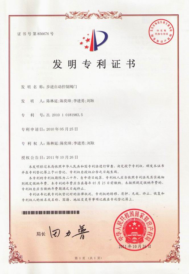 經(jīng)過公司研究人員兩年多的不懈努力,刻苦鉆研“步進(jìn)自動控制閥門”研發(fā)成功,并于2010年5月25日向國家知識產(chǎn)權(quán)局申請專利保護(hù)。國家知識產(chǎn)權(quán)局經(jīng)過實(shí)質(zhì)性審查,于2011年10月26日授予專利權(quán)并頒發(fā)發(fā)明專利證書。