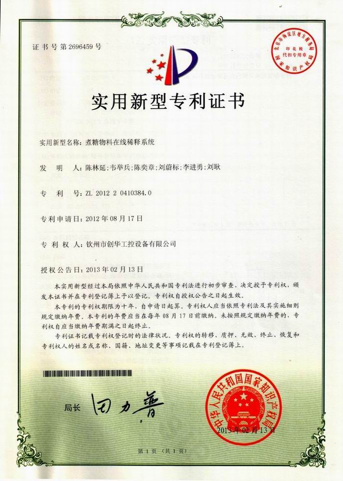 近日,我公司自主研發(fā)的“煮糖物料在線稀釋系統(tǒng)”獲得國(guó)家知識(shí)產(chǎn)權(quán)局實(shí)用新型專利授權(quán)。本系統(tǒng)是我公司針對(duì)糖廠目前在結(jié)晶過(guò)程中間歇入料,不能做到沸點(diǎn)入料及任意錘度稀釋的現(xiàn)狀而自主研發(fā)的,該系統(tǒng)安裝在原料箱和煮糖罐之間,通過(guò)PLC控制,實(shí)現(xiàn)入料溫度可調(diào),入料錘度可調(diào),并且在結(jié)晶過(guò)程中能實(shí)現(xiàn)連續(xù)入料,為結(jié)晶過(guò)程的平穩(wěn)進(jìn)行創(chuàng)造有利條件。該系統(tǒng)的應(yīng)用,對(duì)于糖廠節(jié)能降耗和提高回收有一定的幫助。
