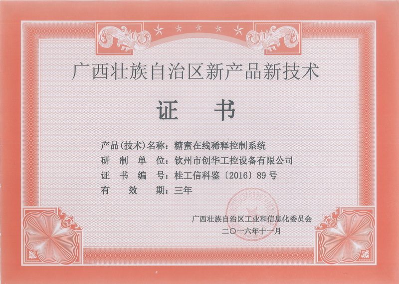 項(xiàng)目針對(duì)糖廠結(jié)晶工段糖蜜稀釋工序無(wú)法按需連續(xù)稀釋、溶晶不徹底、溫度波動(dòng)大,影響產(chǎn)品質(zhì)量和糖分回收的現(xiàn)狀,研發(fā)出“糖蜜在線(xiàn)稀釋系統(tǒng)”,實(shí)現(xiàn)了糖蜜稀釋過(guò)程中溶晶徹底,錘度和溫度有效控制,使結(jié)晶罐能做到沸點(diǎn)連續(xù)入料。項(xiàng)目產(chǎn)品“糖蜜在線(xiàn)稀釋系統(tǒng)”獲得廣西壯族自治區(qū)工業(yè)和信息化委員會(huì)委頒發(fā)的新產(chǎn)品新技術(shù)證書(shū)。
